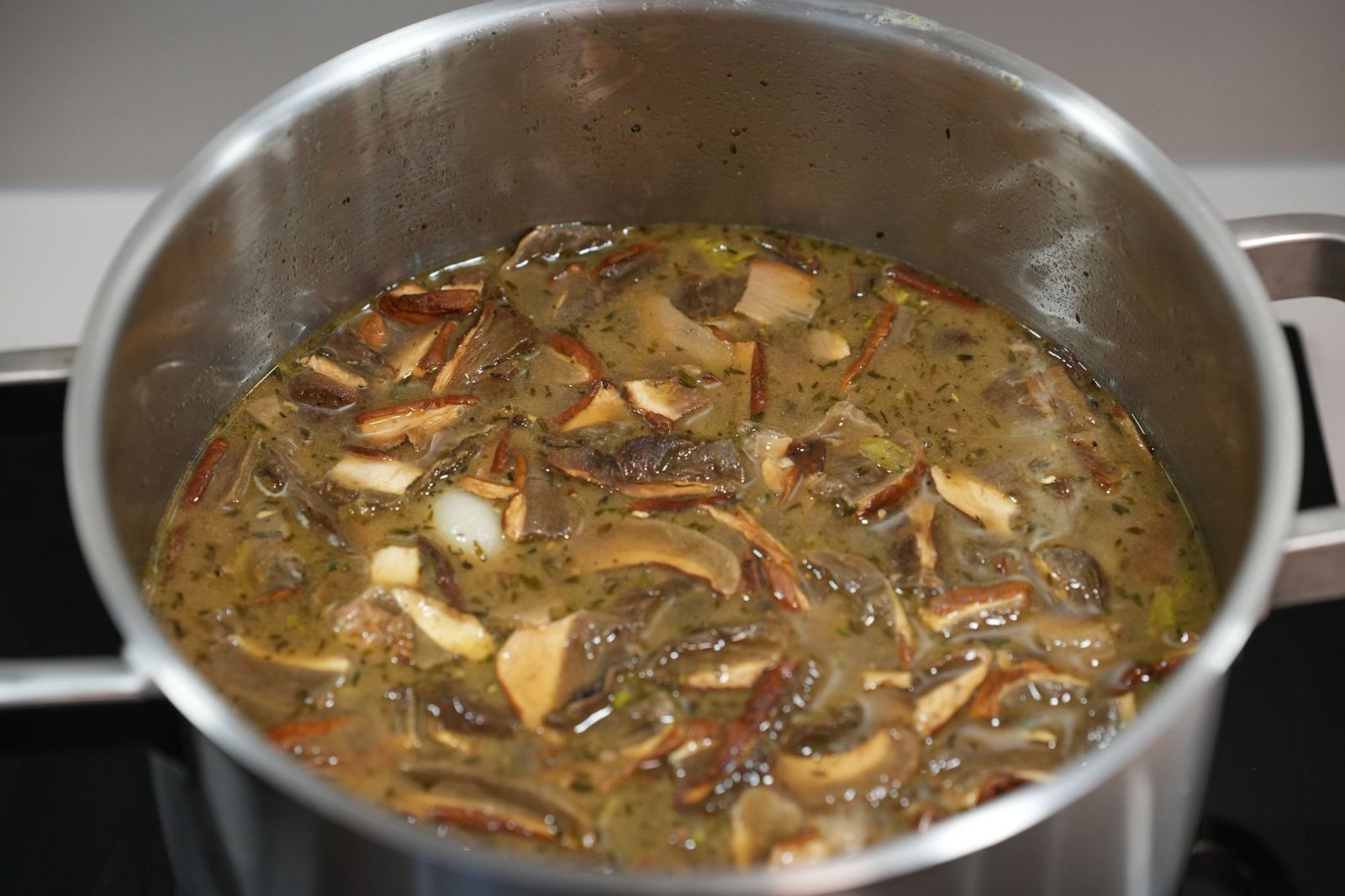 Der erdige Tiefgang (Steinpilz): Durch das Trocknen ist der Steinpilz (Boletus edulis) eine wahre Umami-Bombe. Er gibt während der langen Schmorzeit seine tiefen, waldigen und fast fleischigen Noten an die Sauce ab und bildet die kraftvolle Basis des Aromas.